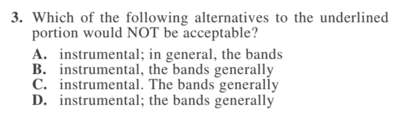 Correct Answer: B. Focus on what the question asks: Which choice would NOT be acceptable? Here's a helpful tip related to the ACT English section: If you see a period (.) and a semicolon (;) creating the same sentence, you can typically eliminate these options. In option B, the replacement of the phrase in the sentence would create a run-on sentence, making the sentence grammatically incorrect.