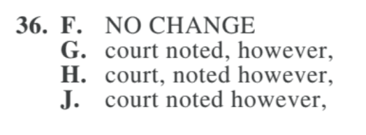 Correct Answer: G. Option G effectively uses commas to set off the word "however" as an interrupter. In this case, "however" is a transitional word that adds some contrast or unexpected information to the sentence.