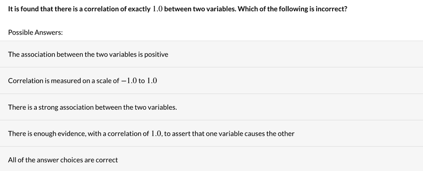 First, let's read through the question and establish what we know. We already know that a correlation coefficient of 1.0 shows a strong positive correlation between the two variables, but not a cause and effect relationship. Now, we can look through the answer choices and identify which is not correct. We have already established that the association is positive, so we know it is not the first answer. We also know that correlation is measure on a scale from -1 to +1, so we can cross off the second choice as well. We also see that there is a strong correlation due to the coefficient of 1, so we can eliminate answer three. The fourth answer however, says that one variable causes another. Correlation and causation are not the same. Causation cannot be assumed from correlation or a correlation coefficient.