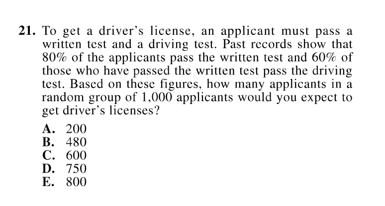 This question asks us to use past data to predict the expected outcomes for a group of 1000 people. We can assume, since the question states that it is a random group of applicants, that the same percentages of success can be applied to this sample. Therefore, we can start by identifying how many people can be expected to pass the written test. This should be 80% of 1000, or 1000(0.8) which equals 800 people. Next, we know that of these 800 people, only 60% can also be expected to pass the driving test. So, we should find 60% of 800, or 800(0.6) which equals 480.