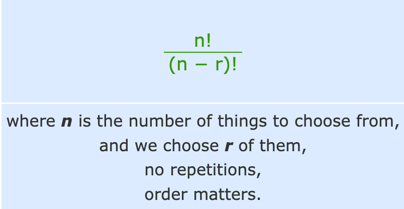- Non-repeating Permutations- - These are permutations where the same event cannot happen more than once.- - Let's say a new brand of phone was released, where the same number cannot be used more than once in a password.- - How many permutations of passcodes would there be?- - Let's follow the same process as before.- - First, we need to find the number of possibilities for the first digit. In this case, it is still 10.- - Next, let's find the number of options for the second digit. Since one number has already been used in the first digit of the passcode, we are left with only 9 options.- - Let's see how many options we have for the third digit. Since 2 numbers have been used, there are only 8 number options left.- - This continues all the way to the sixth digit- - So, the number of permutations is: (10 x 9 x 8 x 7 x 6 x 5) = 151,200 possible password permutations- - However, this mathematical process can be tiring-- especially if there are many more options.- - Another way to approach this is to use factorials.- - A factorial multiplies a number by every other number below it until it reaches zero.- - **There is one exception, since the factorial of 0 is 1.- - A factorial is written as a number with an exclamation point- - 3! = 3 x 2 x 1- - Another way we could write the process for this problem is 10!/(10-6)! or 10/4!- - That's the same as (10 x 9 x 8 x 7 x 6 x 5 x 4 x 3 x 2 x 1) / (4 x 3 x 2 x 1) = (10 x 9 x 8 x 7 x 6 x 5) which equals 151,200- - This is the equation for non-repeating permutations: