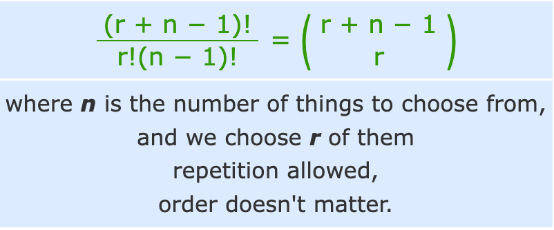 - Repeating Combinations- - In repeating combination questions, the order of events does not matter, and each event can also happen multiple times.- - Let's start by looking at the equation.