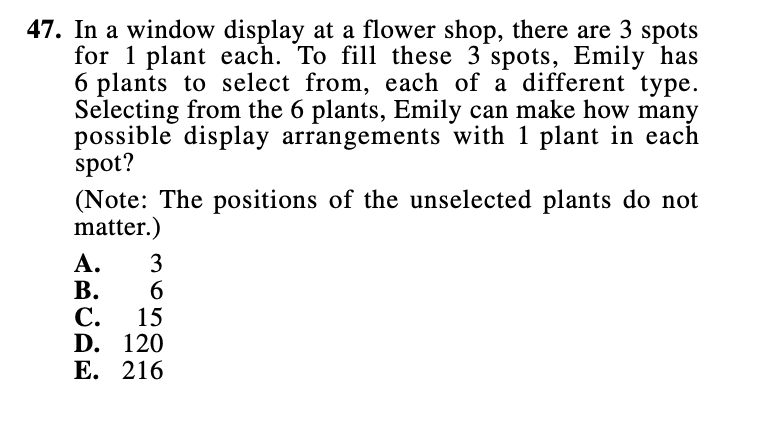 Emily has 6 plants to choose from, so n=6. There are 3 spots she can put the plants in, so r= 3