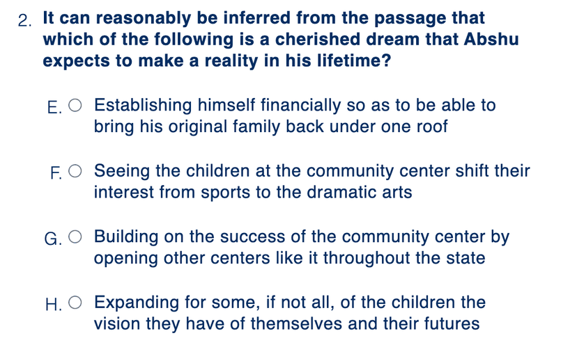 In this question, we can start by looking at the wording of the prompt. In other words, the question is asking "What did Abshu dream of doing?" Looking at the text this question references, we can see that "Clifford Jackson, or Abshu, as he preferred to be known in the streets, had committed himself several years ago to use his talents as a playwright to broaden the horizons for the young, gifted, and blackโwhich was how he saw every child milling around that dark street." From this sentence, let us try to reword the information given, which gives us the idea that "Abshu, as a playwright, wanted to broaden the horizons of the children around him." This statement precisely matches the ideas expressed in answer choice H, and by re-reading the text that the question refers to, as well as re-wording the ideas expressed to make sure we understand it all (!), we were able to get this answer!ย