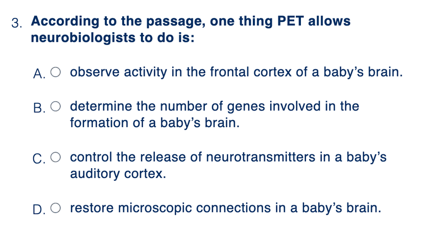 In this example, we can see that the question is fairly straightforward. Our main task is identifying where in the text this information is written. We can see information about the usage of PET scans around lines 16-25, and we can summarize the information presented in these lines as "PET scans show regions of baby's brains turn on, including the primitive brain stem, sensory cortex, visual cortex, and frontal cortex". This closely matches answer choice A, as the idea of observing activity in the frontal cortex of the baby's brain is mentioned in these lines. Thus, our answer is A.ย