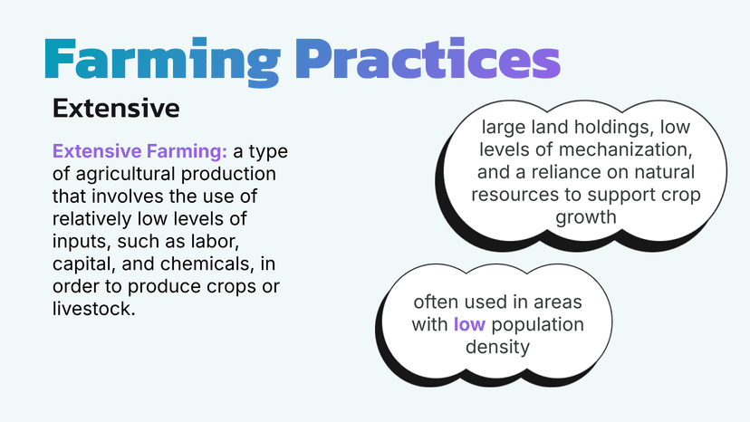 Farmers choose extensive farming when land is cheap or plentiful, labor is scarce or expensive, and environmental conditions (dry, semi-arid, savanna, or mountainous) make intensive, high-input methods inefficient. Extensive systems—like shifting cultivation, nomadic herding, ranching, or transhumance—use large areas with low labor and capital per hectare, rely on natural fertility or seasonal movement, and suit low population densities. Mechanization (big machines) and lower market access also favor extensive practices because per-unit labor costs stay low even if yields per hectare are smaller. On the AP exam, link this to PSO-5: show how physical geography and resource availability shape agricultural choices (EK PSO-5.A.1 and EK PSO-5.A.3). For more examples and quick review, see the Topic 5.1 study guide (https://library.fiveable.me/ap-human-geography/unit-5/intro-agriculture/study-guide/ascRt2BlCv4BX7lfzXSM) and try practice problems (https://library.fiveable.me/practice/ap-human-geography).