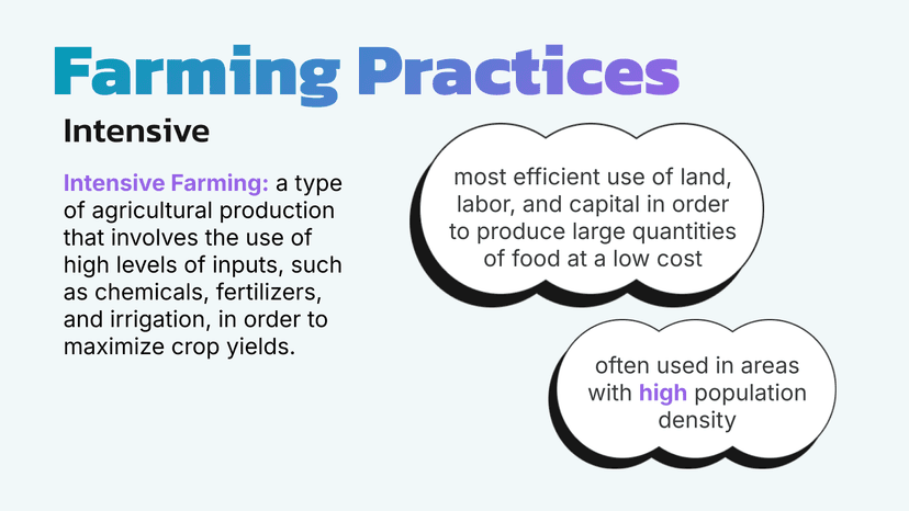 | intensive farming | Agricultural practices that maximize productivity per unit of land through high inputs of labor, capital, or technology. |