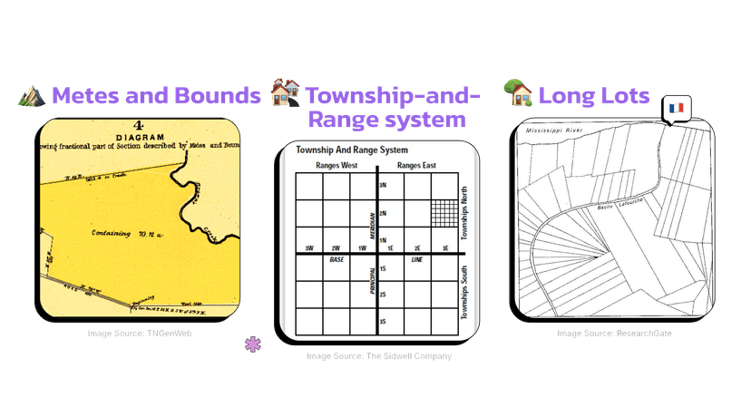 | township and range | A survey method that divides land into a grid system of townships and ranges, commonly used in the United States. |