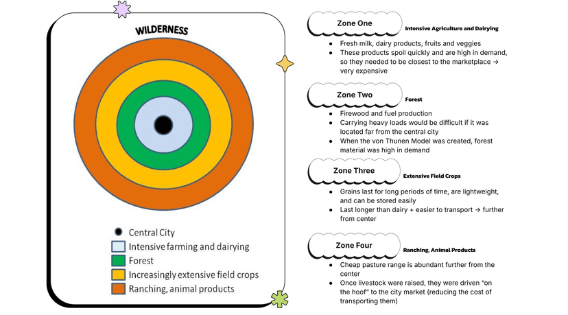 Von Thünen pictured agricultural land as concentric rings around a single market. From the center outward: - Market/City (center)—where produce is sold. - Ring 1: Market gardening & dairy—intensive, perishable, high transport costs (vegetables, milk). - Ring 2: Forest/wood—bulky fuel and building materials (close enough to carry). - Ring 3: Grain/field crops—less perishable, grown on larger plots, lower transport cost per unit. - Ring 4: Ranching/animal grazing—extensive, needs lots of land, animals can be driven to market. The model explains spatial organization through transportation costs, bid-rent, and distance-decay: closer land supports high-value, intensive uses. Remember AP: use von Thünen to describe how transport costs shape land use (EK PSO-5.D.1), but real regions and specialty farming don’t always form perfect rings. For a quick review on this topic see the Fiveable study guide (https://library.fiveable.me/ap-human-geography/unit-5/von-thunen-model/study-guide/Yp98AboJ2DQWeTo9hDam) and try practice questions (https://library.fiveable.me/practice/ap-human-geography).