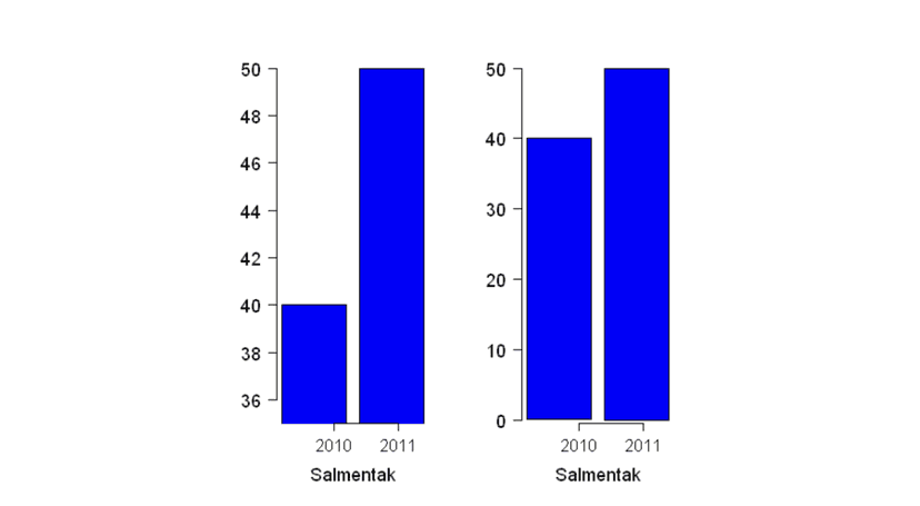 - Using bar/pie charts to show a false impression of size: Truncated bar graphs (bar graphs that don't start at a y-value of 0) can be misleading if the truncation is not clearly labeled or if the truncation is done in a way that distorts the data. For example, if the truncation is done at an arbitrary value, it could give the impression that the data is more evenly distributed than it really is. See the example below and notice how the differences between 2010 and 2011 are more noticeable in a truncated bar graph (left) compared to the usual bar graph (right).