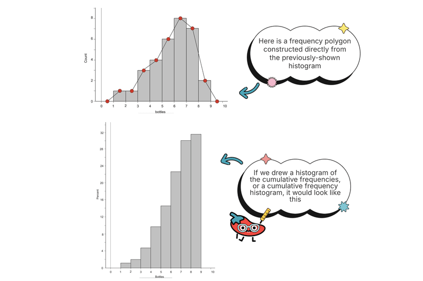 Frequency counts how many observations fall inside each bin or value—like the height of a histogram bar or the dots stacked in a dotplot. For example, if 12 students scored between 70–79, the frequency for that bin is 12. Cumulative frequency (an ogive or cumulative graph) adds up frequencies up to a given value: it shows how many observations are ≤ that cutoff. So at 79 you’d plot the total number of students scoring ≤79 (e.g., 38). The cumulative curve always rises (or stays flat) and ends at the sample size. When to use each: use frequency/relative frequency to see shape, peaks, gaps, and skew (UNC-1.G.1, UNC-1.G.3). Use cumulative graphs (UNC-1.G.4) to find percentiles or medians quickly (read the x-value where the ogive crosses 50% or n/2). For more examples and practice, check the Topic 1.5 study guide (https://library.fiveable.me/ap-statistics/unit-1/representing-quantitative-variable-with-graphs/study-guide/VWtyLVDvjzEgtbAi6v6j) and try problems at (https://library.fiveable.me/practice/ap-statistics).