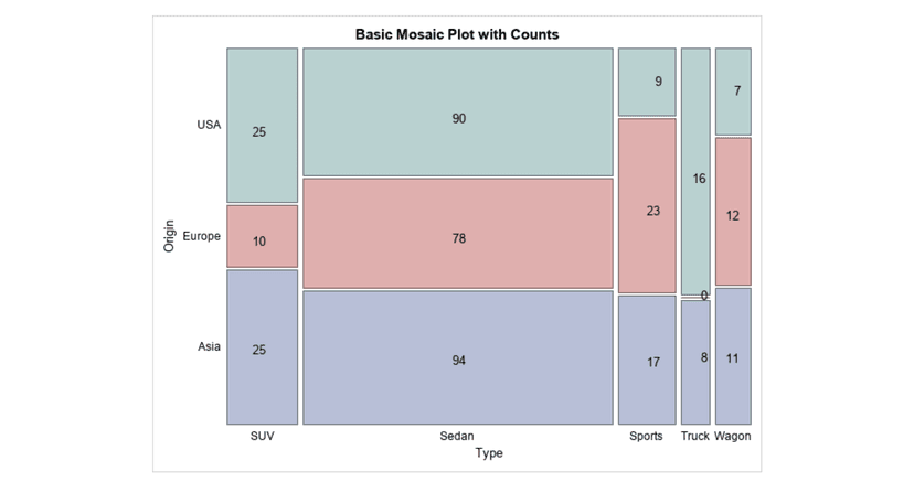 Another way to think of a mosaic plot is that it is a graphic version of a two-way table. Mosaic plots can be useful for showing the relationship between two categorical variables and for comparing the proportions of data points in different categories. Here is an example of a mosaic plot: