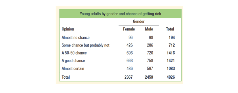 For example, the conditional frequency for “50-50 chance given male” is 720/2459 because out of the 2459 males who responded, 720 of them said “50-50 chance.” When calculating a conditional relative frequency, our denominator (or total) is usually considerably smaller than that of overall total.