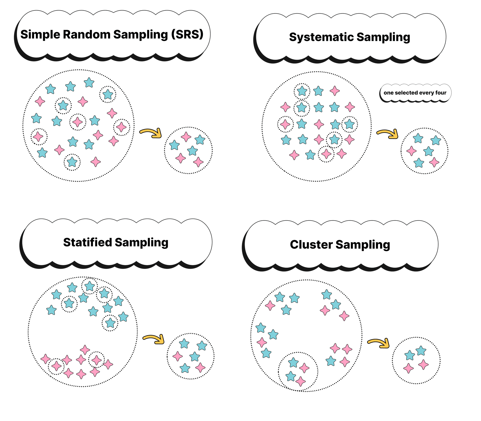 - Simple random sampling: You could create a list of all the college students in the United States and use a random number generator to select a sample of students from the list. This method would ensure that every student in the population has an equal chance of being selected, but it would be time-consuming and expensive to create a complete list of all the college students in the United States.