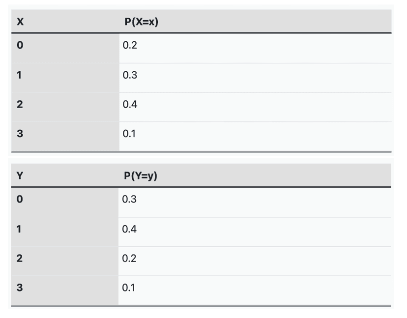Two random variables, X and Y, represent the number of hours a student spends studying for a math test and the number of hours a student spends studying for a science test, respectively. The probability distributions of X and Y are shown in the tables below: