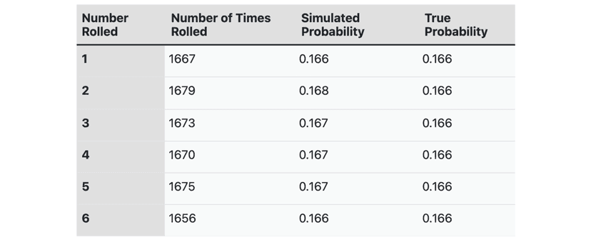 The professor then calculates the simulated probability of rolling each number, and compares these probabilities to the true probability of rolling each number (which is 1/6 for each number). The results of the simulation are shown in the table below: