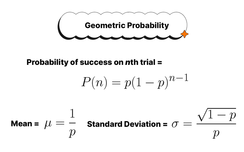 If X is the trial number of the first success and each trial is independent with success probability p, the geometric probability mass function is P(X = x) = (1 − p)^(x−1) · p, for x = 1, 2, 3, … That means you get x−1 failures (each with probability 1−p) then a success (probability p). The geometric distribution has mean μ = 1/p and standard deviation σ = sqrt(1 − p)/p, and it’s memoryless (past failures don’t change future chances). This matches the AP CED UNC-3.E and UNC-3.F learning objectives. For more review and AP-style practice on Topic 4.12, check the Geometric Distribution study guide (https://library.fiveable.me/ap-statistics/unit-4/geometric-distribution/study-guide/wcfJTWpCUGP5PNhthkEC) and the Unit 4 overview (https://library.fiveable.me/ap-statistics/unit-4). Want extra practice? There are 1000+ AP Stats problems at (https://library.fiveable.me/practice/ap-statistics).