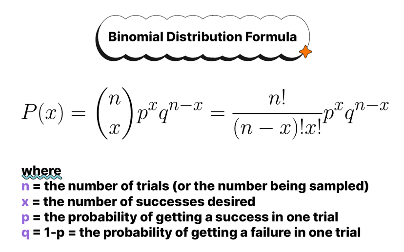 For example, suppose you flip a coin 10 times, and you want to know the probability of getting exactly 5 heads. In this case, X is a binomial random variable that counts the number of heads in the 10 flips. The probability of success is p = 0.5 (since the coin is fair), and the probability of failure is 1 - p = 0.5.