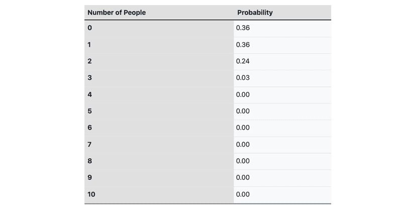 A recent study found that the probability that a person will develop a certain type of cancer is 0.01. This probability is independent of all other persons. The table below shows the number of people in a group of 10 people and the probability that exactly that number of people in the group will develop this type of cancer: