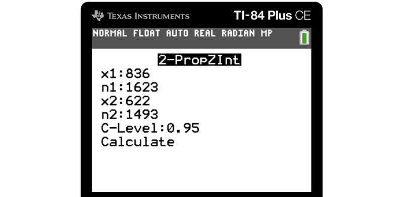 Using a calculator for our calculations, we entered our data into "2 Prop Z Interval"