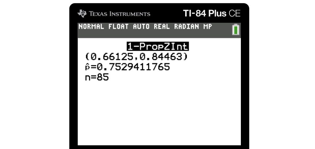 A much easier, more efficient way of calculating a confidence interval is to use a graphing calculator or other form of technology. When using a graphing calculator such as a Texas Instruments TI-84, you would select 1-Prop Z Interval from the Stats menu, enter your number of successes (x), sample size (n), and confidence level. Lastly, calculate and you will get the confidence interval you requested!