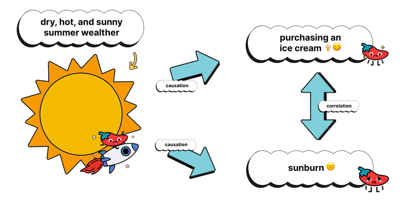 As we stressed in Unit 2, two variables may be correlated, but that does not establish a cause and effect relationship. As in the example above, a hot sunny day causes the ice cream to melt and it also causes sunburn. However, it would be silly to say that ice cream melting causes sunburn. The two things are correlated due to another variable: the hot sun (which influences ice cream consumption and sunburn).