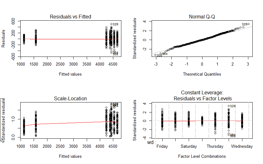 - A consistent spread of residuals across the range of fitted values in the residuals vs. fitted values plot indicates that the homoscedasticity assumption is met (no funnel shape or increasing/decreasing spread)
