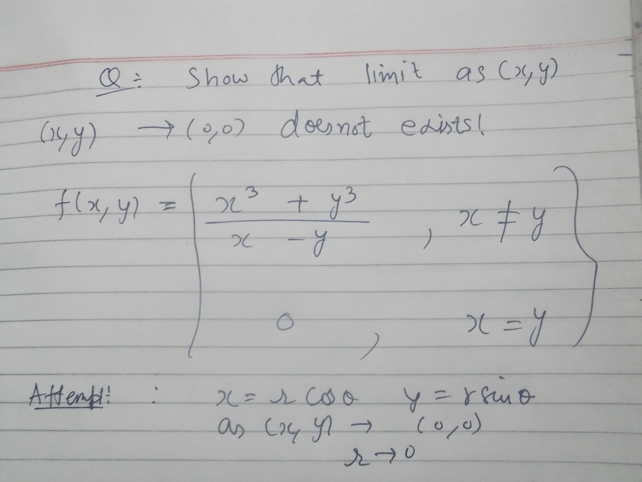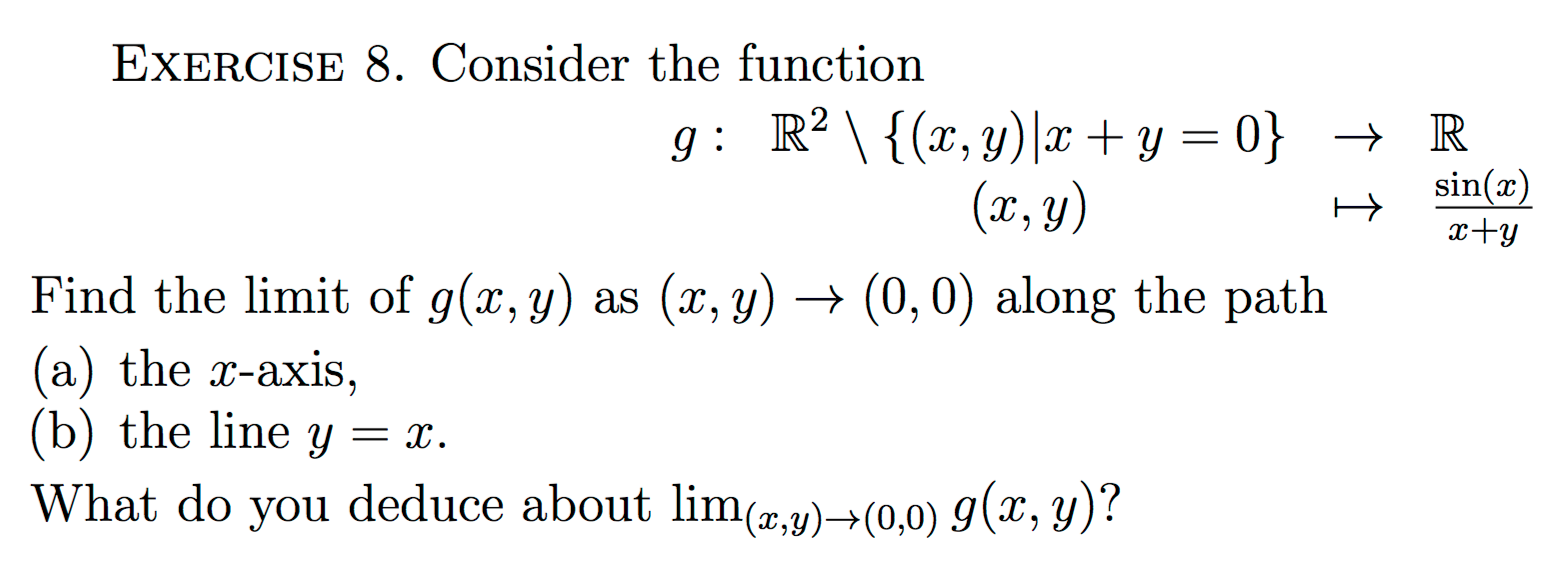 - Example: $\lim_{(x,y)\to(0,0)}\frac{xy}{x^2+y^2}$ has different limits along the paths $y=mx$ and $y=x^2$
