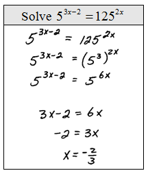 - $5^x = 5^{2x - 1}$ becomes $x = 2x - 1$, simplify to $1 = x$