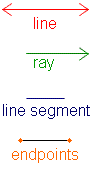 - Rays consist of an endpoint and extend infinitely in one direction denoted by an endpoint and another point on the ray with a ray symbol above them ($\overrightarrow{EF}$)