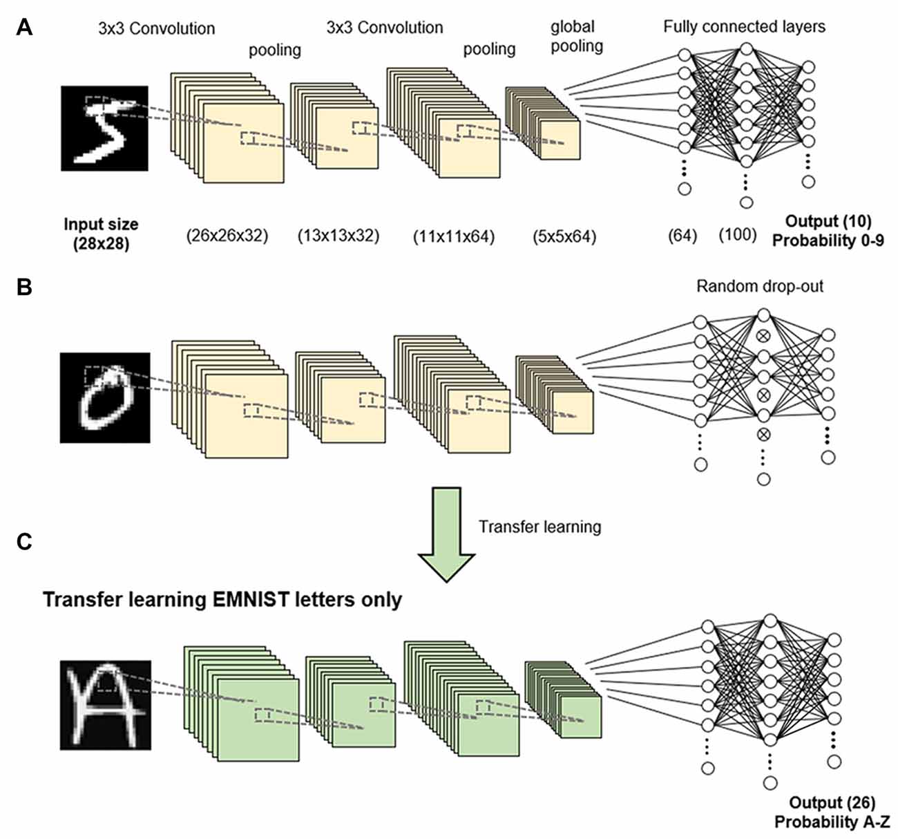 - Fully connected networks benefit from dropout in dense layers