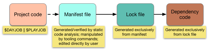 - Dependencies are declared with their name and version constraints