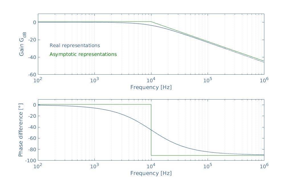 - Vertical axis of phase plot uses linear scale for phase shift in degrees