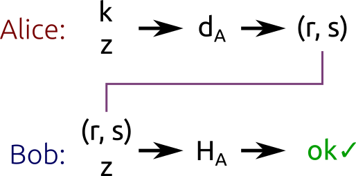 - The $s$ component is calculated as $s = k^{-1}(z + rd) \bmod n$, where $z$ is the hash digest, $d$ is the private key, and $n$ is the order of the base point