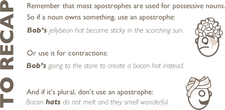 - Apostrophes show possession for singular nouns by adding 's (dog's bone, Charles's book)