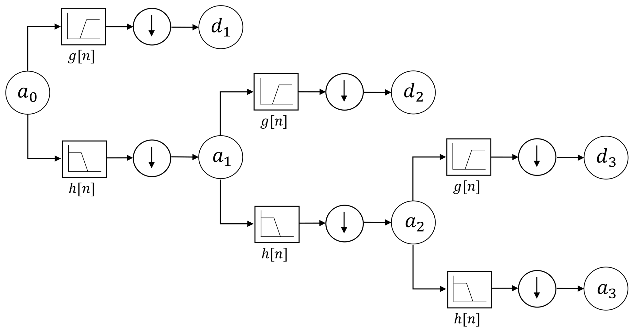 - The decomposition process can be performed iteratively, with each subsequent level providing a coarser approximation and finer details of the signal