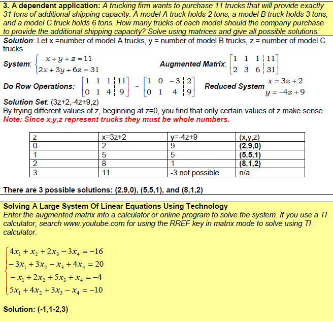 - Three-variable system: x + 2y - z = 3, 2x - y + 3z = 1, 3x + y - 2z = 4