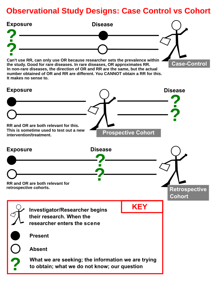 - Case-control studies compare individuals with a specific outcome (cases) to those without the outcome (controls) and look back to determine the exposure status (study of thalidomide and birth defects)