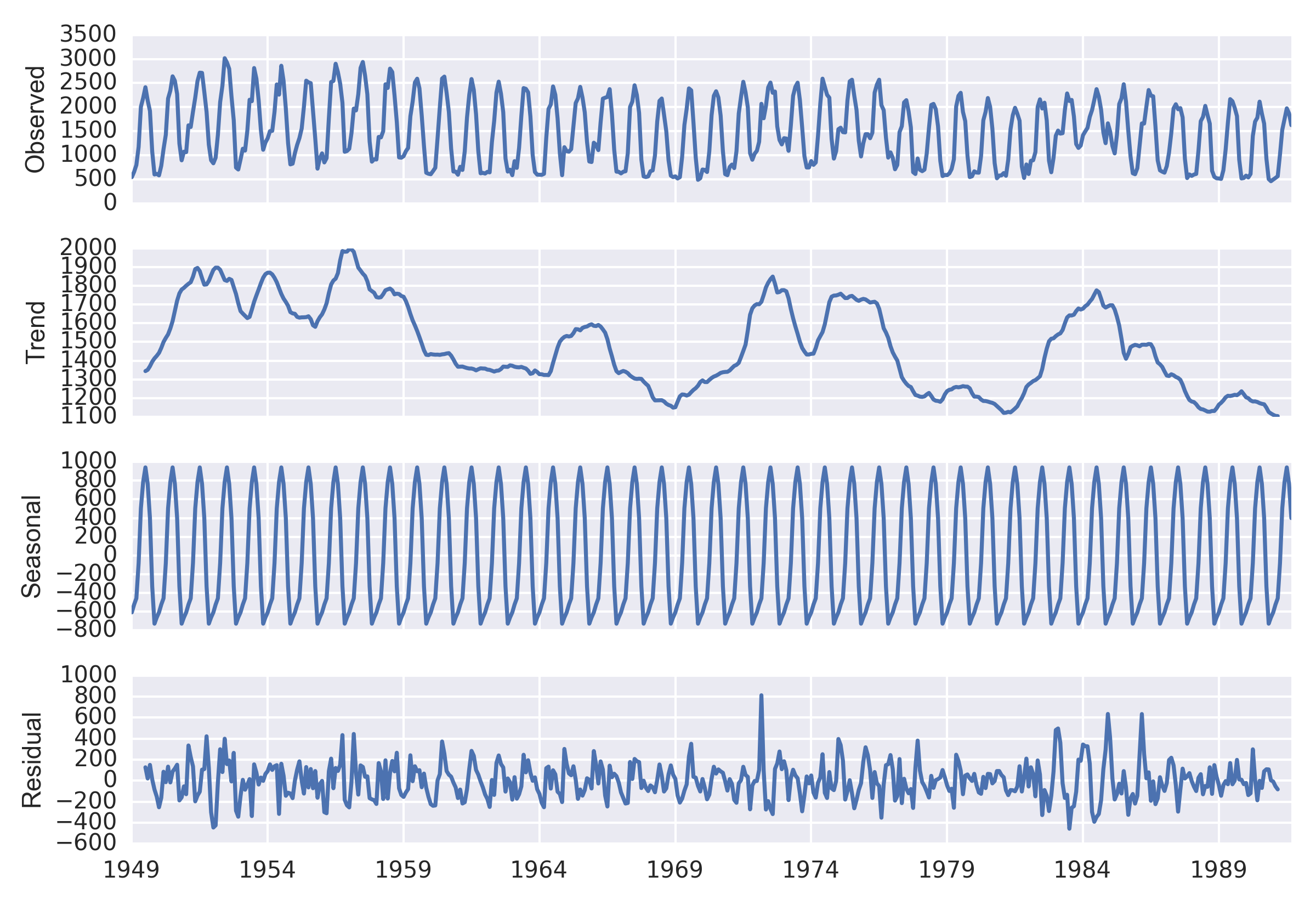 - Seasonal decomposition plots separate trend, seasonal, and residual components