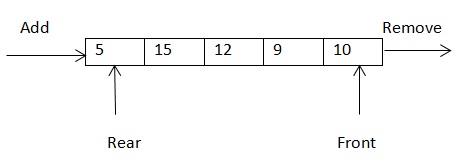 - Elements enter the queue at one end (rear) and exit from the other end (front)