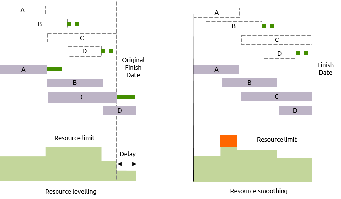 - Resource leveling smooths out fluctuations in resource usage over project duration