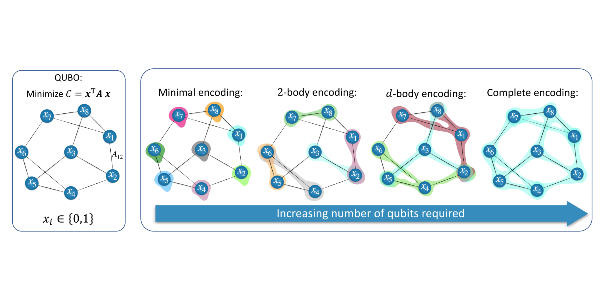 - Example: A 4-dimensional data point $(x_1, x_2, x_3, x_4)$ can be encoded into a 2-qubit state $|\psi\rangle = x_1|00\rangle + x_2|01\rangle + x_3|10\rangle + x_4|11\rangle$